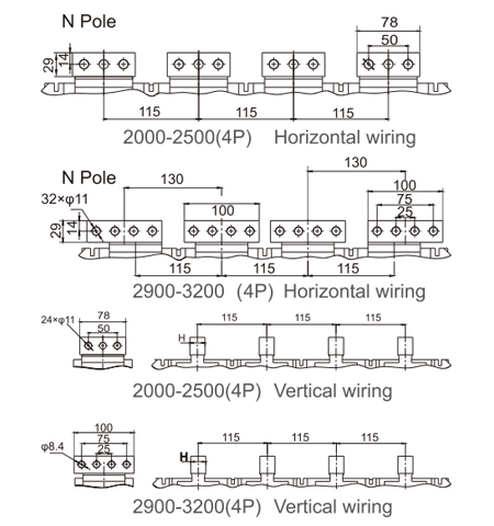 | Rated current (A) | External copper bar specification W x T(mm) | Number of pieces per terminal | Sectional area of each terminal(mm²) |